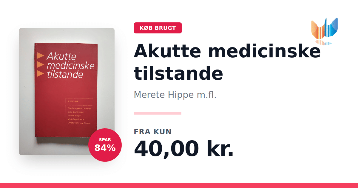 Lige nu kan du købe "Akutte medicinske tilstande" af Merete Hippe m.fl. til kun 40,00 kr. Du sparer hele 84% af nyprisen! Bogen du ser her er brugt, og i god stand. Vi har i øjeblikket 2 eksemplarer til salg af "Akutte medicinske tilstande", så husk at se de forskellige udgaver.