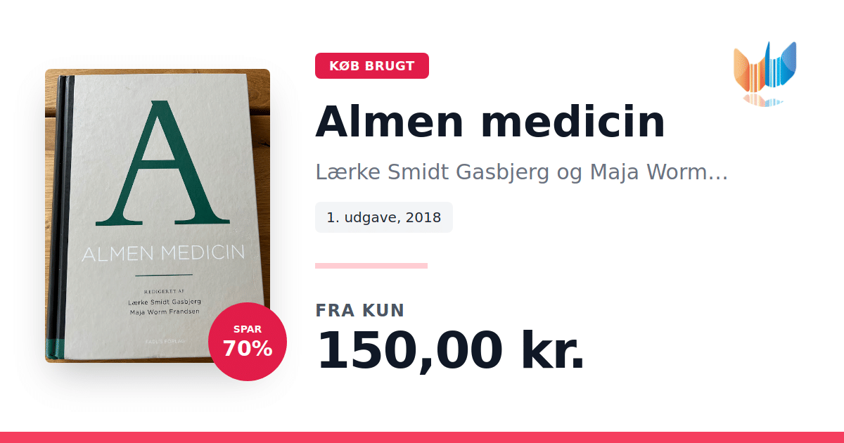 Lige nu kan du købe "Almen medicin" af Lærke Smidt Gasbjerg og Maja Worm Frandsen til kun 150,00 kr. Du sparer hele 70% af nyprisen! Bogen du ser her er brugt, og i perfekt stand. Vi har i øjeblikket 2 eksemplarer til salg af "Almen medicin", så husk at se de forskellige udgaver.