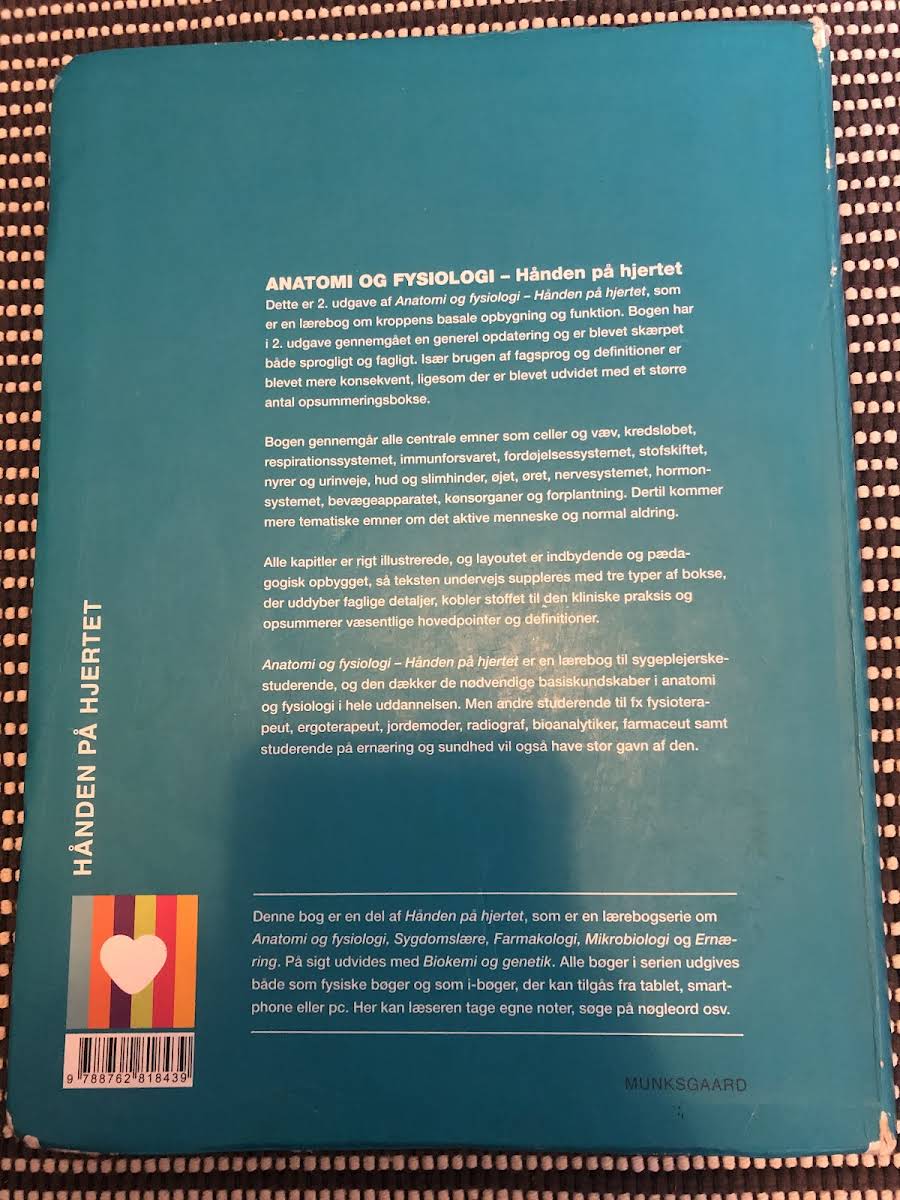 Anatomi og fysiologi – hånden på hjertet (2. udgave) giver en grundig og opdateret introduktion til kroppens struktur og funktion. Denne udgave har fået et skærpet sprog og konsekvent anvendelse af fagsprog og definitioner, der sikrer en klar og præcis formidling af stoffet. Bogen gennemgår alle centrale emner, herunder celler og væv, kredsløb, respirationssystemet, immunforsvaret, fordøjelsessystemet, stofskiftet, nyrer og urinveje, hud og slimhinder, øjet og øret, nervesystemet, hormonsystemet, bevægeapparatet samt kønsorganer og forplantning. Derudover berøres tematiske aspekter som det aktive menneske og normal aldring. Med rigt illustrerede kapitler og et indbydende layout, der understøttes af tre typer bokse til uddybning af faglige detaljer, knytter bogen teorien til klinisk praksis og opsummerer de vigtigste hovedpointer og definitioner. Trods sit primære fokus på sygeplejerskestuderende, vil også studerende inden for andre sundhedsprofessioner finde stor gavn af denne velstrukturerede lærebog.