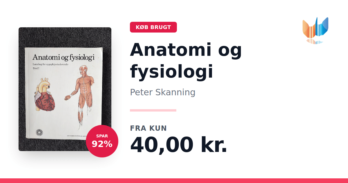Lige nu kan du købe "Anatomi og fysiologi" af Peter Skanning til kun 40,00 kr. Du sparer hele 92% af nyprisen! Bogen du ser her er brugt, og i god stand. Vi har i øjeblikket 2 eksemplarer til salg af "Anatomi og fysiologi", så husk at se de forskellige udgaver.