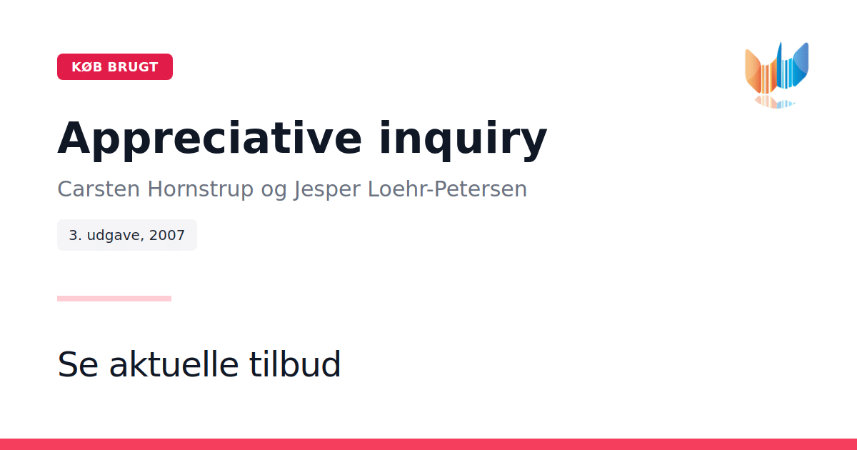 Appreciative Inquiry er en arbejdsmetode, hvor man undersøger sine succeser og bruger dem til at styrke både organisationen, den enkelte medarbejder og hele teams. Denne brugsbog giver et praktisk og letforståeligt indblik i, hvordan man skaber et mere konstruktivt og positivt udgangspunkt for ledelse og udvikling. Forfatterne Carsten Hornstrup og Jesper Loehr-Petersen demonstrerer med konkrete eksempler, hvordan metoden anvendes i diverse sammenhænge såsom organisatoriske udviklingsforløb, gruppeudvikling, supervision, uddannelsesplanlægning samt karriere- og projektledelse. Bogen, der udgives af Jurist- og Økonomforbundet, fremstår som et værdifuldt redskab til at fremme innovation og forandringsvillighed i organisationer.