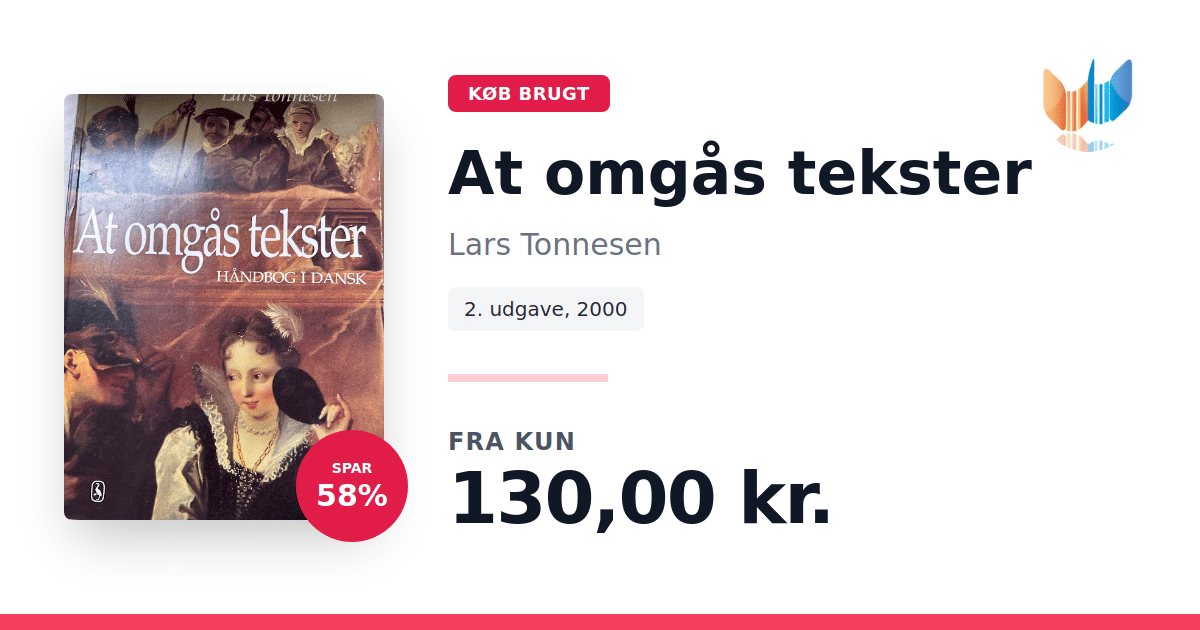 Lige nu kan du købe "At omgås tekster" af Lars Tonnesen til kun 130,00 kr. Du sparer hele 58% af nyprisen! Bogen du ser her er brugt, og i god stand. Vi har i øjeblikket kun et enkelt eksemplar til salg af "At omgås tekster", så slå til mens du kan!