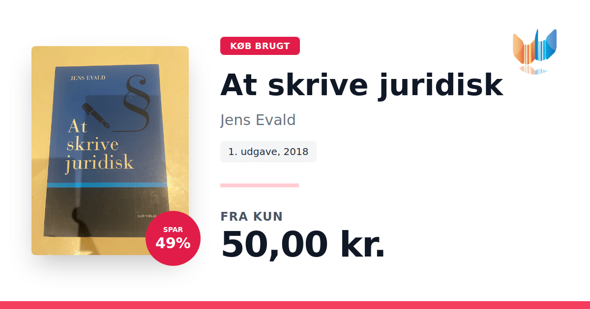 Lige nu kan du købe "At skrive juridisk" af Jens Evald til kun 50,00 kr. Du sparer hele 49% af nyprisen! Bogen du ser her er brugt, og i perfekt stand. Vi har i øjeblikket kun et enkelt eksemplar til salg af "At skrive juridisk", så slå til mens du kan!