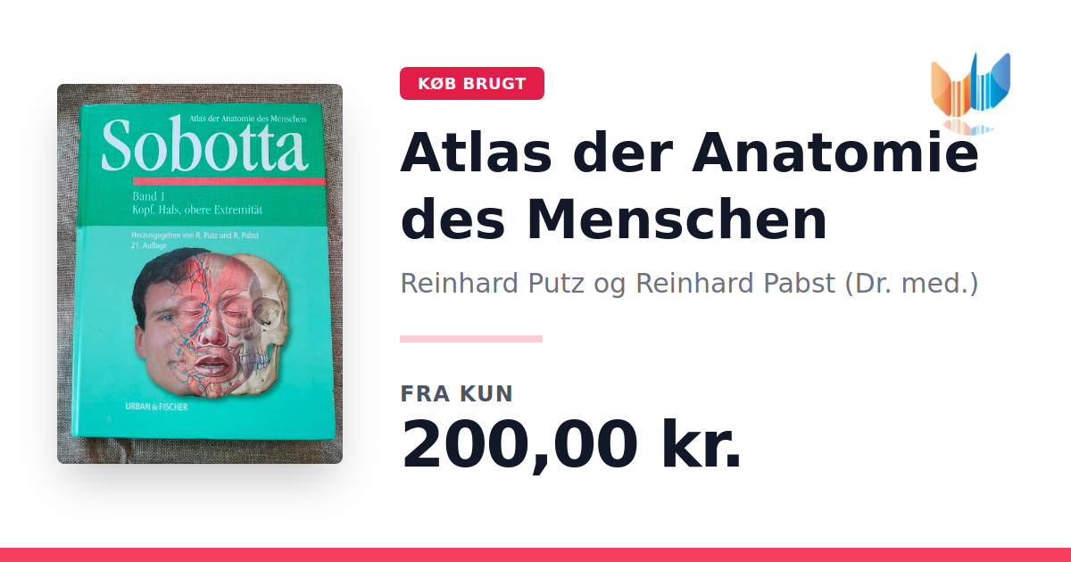 Lige nu kan du købe "Atlas der Anatomie des Menschen" af Reinhard Putz og Reinhard Pabst (Dr. med.) til kun 200,00 kr. Bogen du ser her er brugt, og i god stand. Vi har i øjeblikket 2 eksemplarer til salg af "Atlas der Anatomie des Menschen", så husk at se de forskellige udgaver.