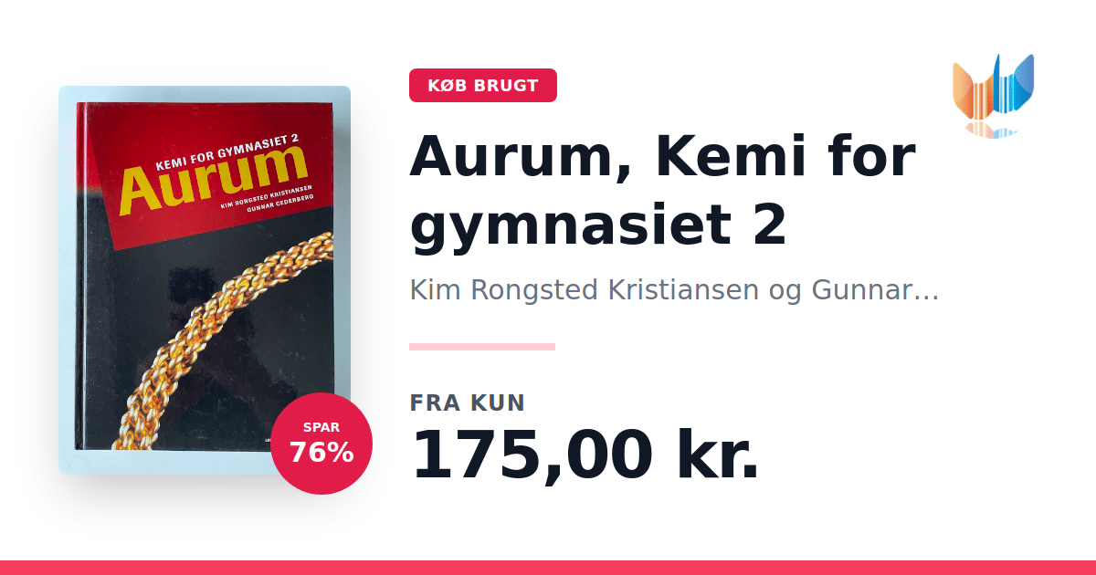 Lige nu kan du købe "Aurum, Kemi for gymnasiet 2" af Kim Rongsted Kristiansen og Gunnar Cederberg til kun 175,00 kr. Du sparer hele 76% af nyprisen! Bogen du ser her er brugt, og i perfekt stand. Vi har i øjeblikket kun et enkelt eksemplar til salg af "Aurum, Kemi for gymnasiet 2", så slå til mens du kan!