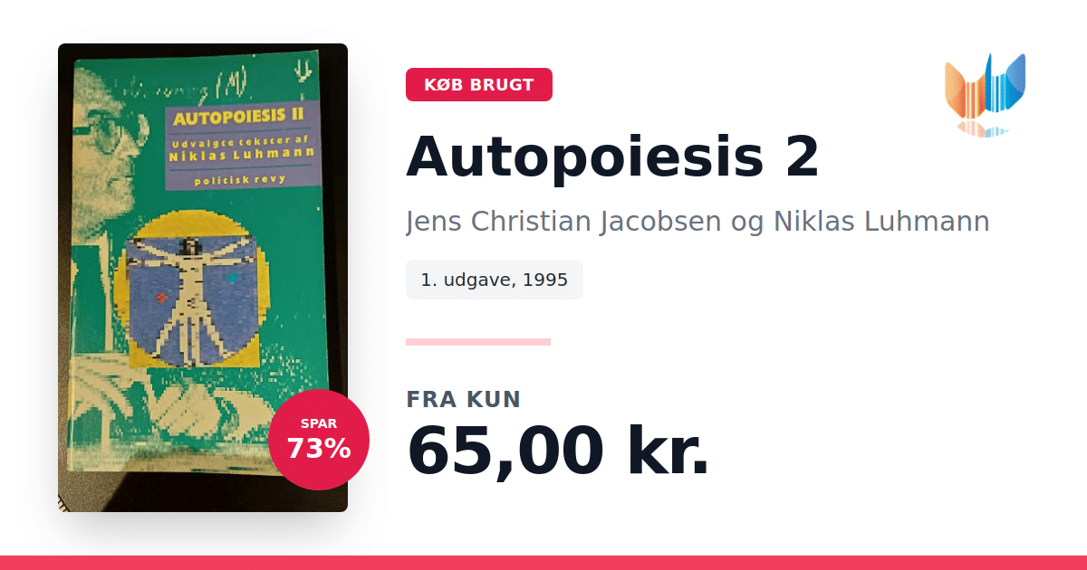 Lige nu kan du købe "Autopoiesis 2" af Jens Christian Jacobsen og Niklas Luhmann til kun 65,00 kr. Du sparer hele 73% af nyprisen! Bogen du ser her er brugt, og i perfekt stand. Vi har i øjeblikket kun et enkelt eksemplar til salg af "Autopoiesis 2", så slå til mens du kan!