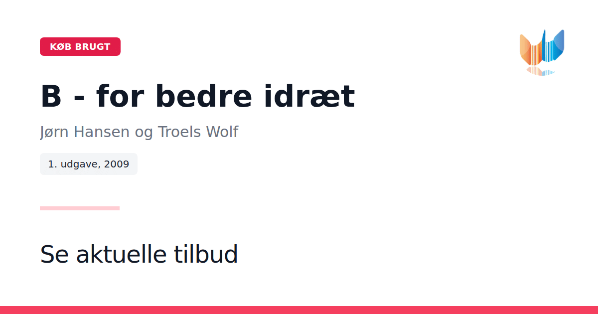 "B - for bedre idræt" byder på en grundig introduktion til idrætsteori med vægt på de mange facetter, der præger B-niveau undervisningen. Bogen udforsker emner som sundhed, anatomi, bevægelseslære, styrketræning og teambuilding gennem et tværfagligt perspektiv, der kombinerer naturvidenskabelige, samfundsmæssige, psykologiske og historiske tilgange. Ved at besvare centrale spørgsmål om, hvilke muskler og led der aktiveres under diverse bevægelser, og hvordan forskellige træningsformer kan understøtte både kondition og styrke, formår Jørn Hansen og Troels Wolf at skabe en omfattende og praktisk orienteret guide. Udover en dybdegående gennemgang af træningsmetoder og fysisk aktivitet, belyser bogen også idrætsadfærd og de underliggende motiver bag vores idrætsudøvelse. Denne første udgave fra Gyldendal, udgivet i 2009, er et essentielt redskab for undervisere og andre med interesse for idrættens udvikling.