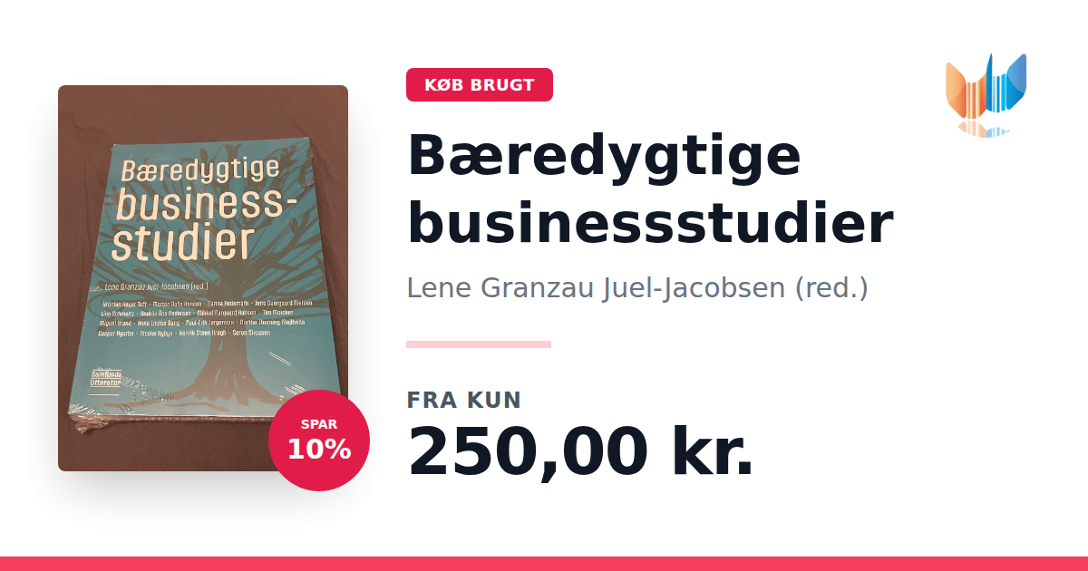 Lige nu kan du købe "Bæredygtige businessstudier" af Lene Granzau Juel-Jacobsen (red.) til kun 250,00 kr. Du sparer hele 10% af nyprisen! Bogen du ser her er brugt, og i perfekt stand. Vi har i øjeblikket kun et enkelt eksemplar til salg af "Bæredygtige businessstudier", så slå til mens du kan!