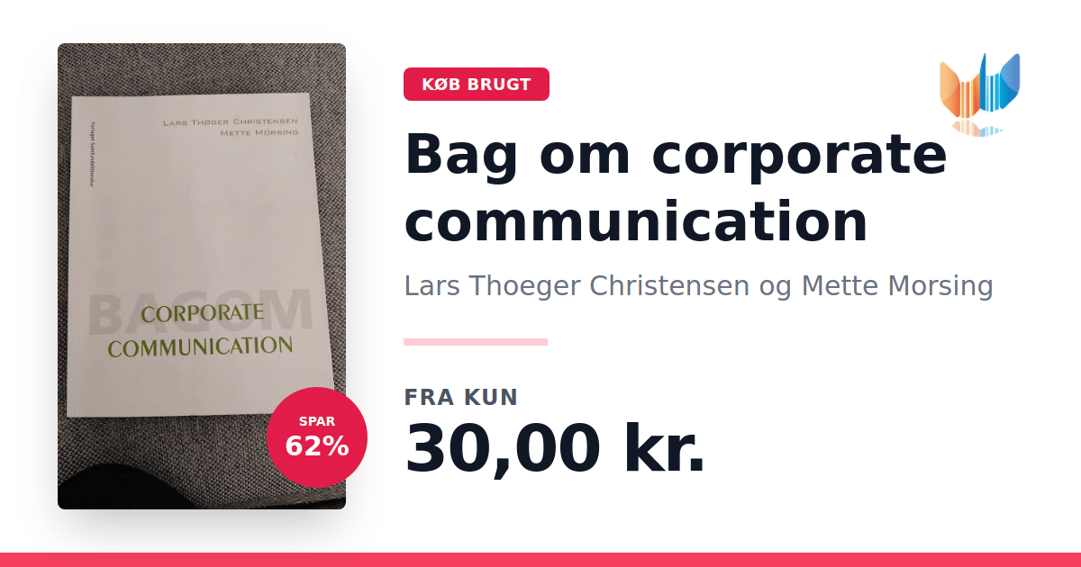 I Bag om corporate communication sætter Lars Thoeger Christensen og Mette Morsing fokus på, hvordan begrebet som ledelsesværktøj er opstået og udviklet sig. Bogen belyser de centrale aktiviteter og de strategiske tilgange, der indgår i corporate communication, og den giver en klar introduktion til, hvordan virksomheder arbejder med denne form for kommunikation. Med udgangspunkt i konkrete overvejelser undersøges, hvad det indebærer for virksomheder at implementere corporate communication i deres daglige praksis. Gennem en systematisk gennemgang af emnet skaber bogen et grundlag for at forstå de underliggende principper og processer bag moderne kommunikationsstrategier.