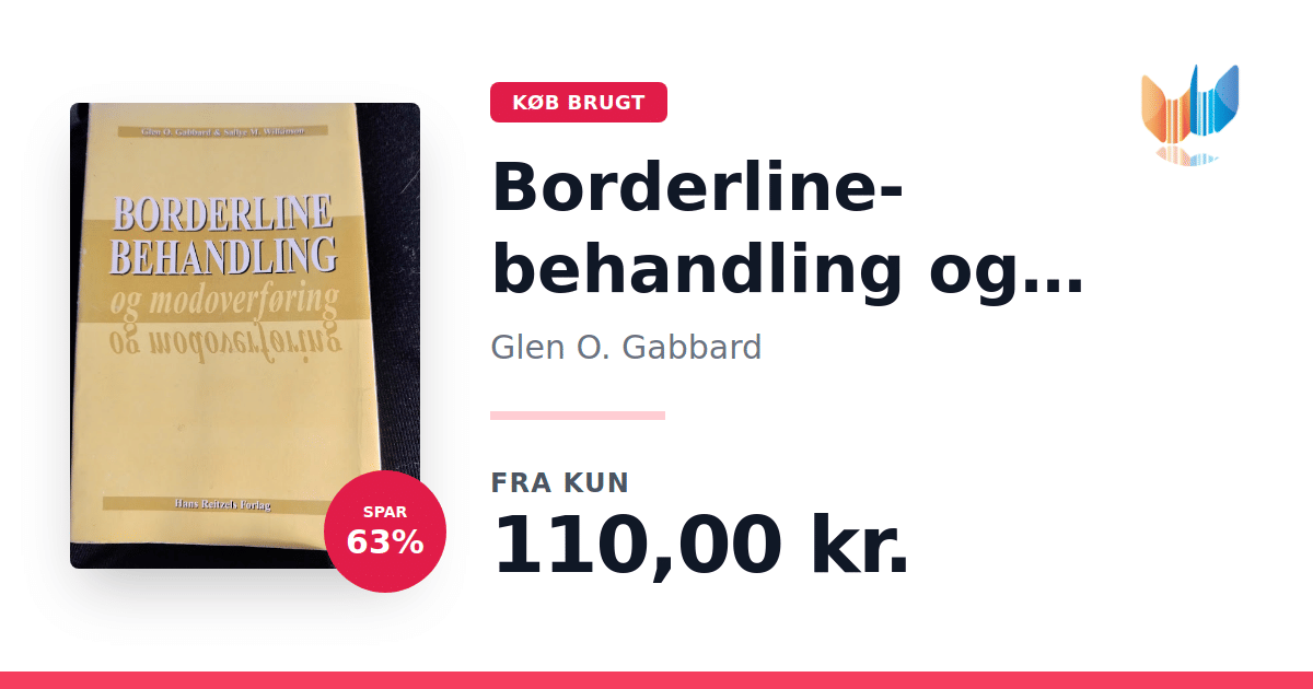 Lige nu kan du købe "Borderline-behandling og modoverføring" af Glen O. Gabbard til kun 110,00 kr. Du sparer hele 63% af nyprisen! Bogen du ser her er brugt, og i god stand. Vi har i øjeblikket kun et enkelt eksemplar til salg af "Borderline-behandling og modoverføring", så slå til mens du kan!