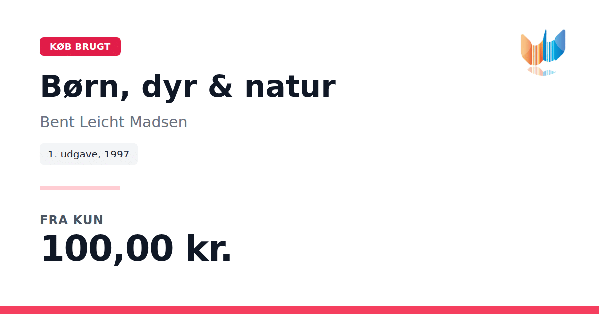 Lige nu kan du købe "Børn, dyr & natur" af Bent Leicht Madsen til kun 100,00 kr. Du sparer hele 66% af nyprisen! Bogen du ser her er brugt, og i god stand. Vi har i øjeblikket 3 eksemplarer til salg af "Børn, dyr & natur", så husk at se de forskellige udgaver.
