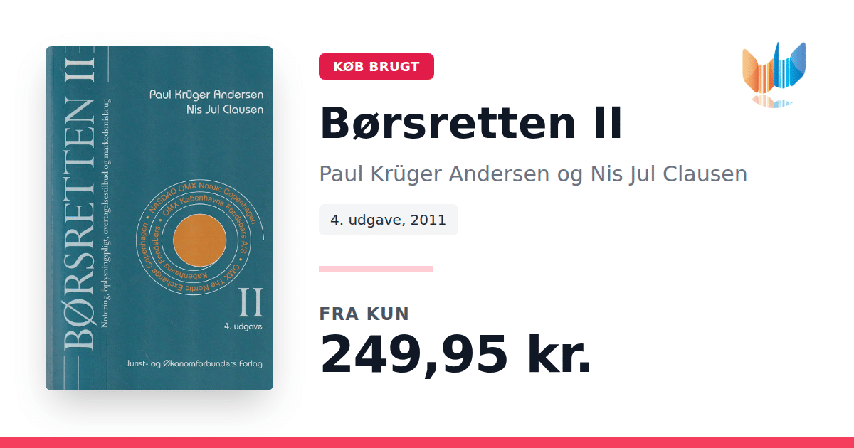 Lige nu kan du købe "Børsretten II" af Paul Krüger Andersen og Nis Jul Clausen til kun 249,95 kr. Bogen du ser her er brugt, og i perfekt stand. Vi har i øjeblikket kun et enkelt eksemplar til salg af "Børsretten II", så slå til mens du kan!