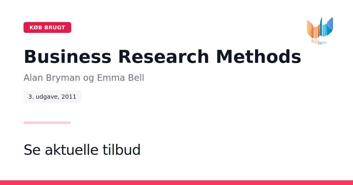 Business Research Methods er en grundlæggende introduktion til at gennemføre erhvervsrettet forskning, skrevet af Alan Bryman og Emma Bell. Bogen henvender sig særligt til studerende inden for business og ledelse, som står over for deres første forskningsprojekter, og trækker på forfatternes erfaringer sammen med indsigter fra studerende og vejledere. Tredje udgave indeholder nyt indspark fra projektvejledere på tværs af universiteter, der guider læseren i valg og gennemførelse af et vellykket forskningsprojekt. Desuden er kapitlet om etik udvidet, og der er øget fokus på praksisnære elementer som projektplanlægning, skriftlig fremstilling og opdaterede metoder til internetbaseret forskning. Bogen understøttes af et Online Resource Centre til studerende med interaktive forskningsværktøjer, videointerviews, datasæt fra teksten, selvrettende multiple choice-spørgsmål, udvalgte web-links og en vejledning i dataanalyse med Excel. For undervisere tilbyder Online Resource Centre en komplet lektørvejledning med foredragsdispositioner, læselister og øvelser, tilpasselige PowerPoint-præsentationer samt figurer og tabeller fra bogen.