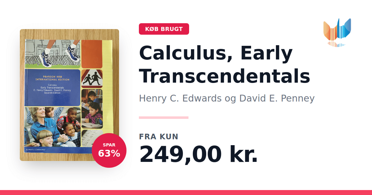 Lige nu kan du købe "Calculus, Early Transcendentals" af Henry C. Edwards og David E. Penney til kun 249,00 kr. Du sparer hele 63% af nyprisen! Bogen du ser her er brugt, og i god stand. Vi har i øjeblikket 4 eksemplarer til salg af "Calculus", så husk at se de forskellige udgaver.