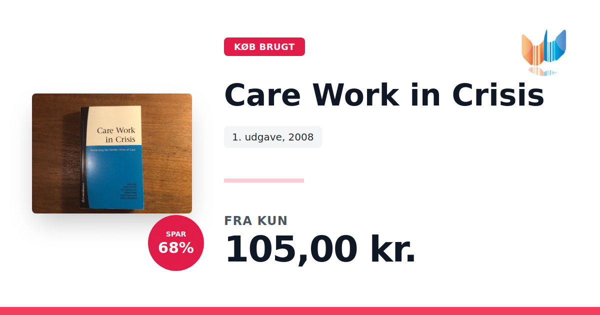 Lige nu kan du købe "Care Work in Crisis" til kun 105,00 kr. Du sparer hele 68% af nyprisen! Bogen du ser her er brugt, og i perfekt stand. Vi har i øjeblikket kun et enkelt eksemplar til salg af "Care Work in Crisis", så slå til mens du kan!