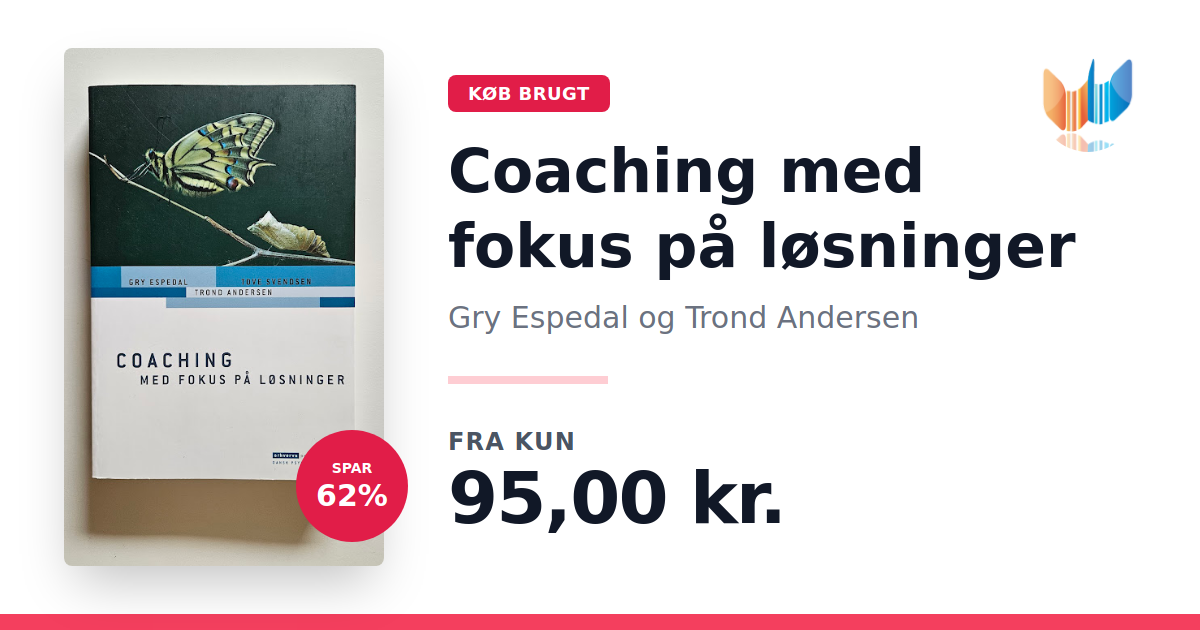Lige nu kan du købe "Coaching med fokus på løsninger" af Gry Espedal og Trond Andersen til kun 95,00 kr. Du sparer hele 62% af nyprisen! Bogen du ser her er brugt, og i perfekt stand. Vi har i øjeblikket kun et enkelt eksemplar til salg af "Coaching med fokus på løsninger", så slå til mens du kan!