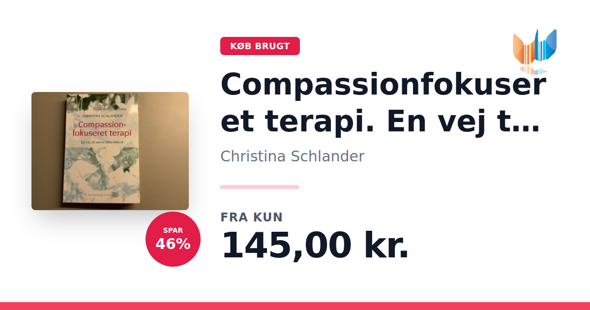 Lige nu kan du købe "Compassionfokuseret terapi. En vej til større tilfredshed" af Christina Schlander til kun 145,00 kr. Du sparer hele 46% af nyprisen! Bogen du ser her er brugt, og i perfekt stand. Vi har i øjeblikket kun et enkelt eksemplar til salg af "Compassionfokuseret terapi. En vej til større tilfredshed", så slå til mens du kan!