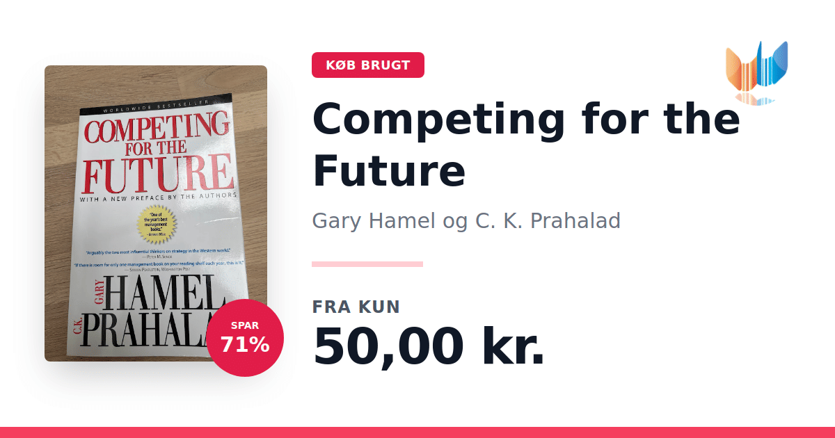 Lige nu kan du købe "Competing for the Future" af Gary Hamel og C. K. Prahalad til kun 50,00 kr. Du sparer hele 71% af nyprisen! Bogen du ser her er brugt, og i god stand. Vi har i øjeblikket kun et enkelt eksemplar til salg af "Competing for the Future", så slå til mens du kan!
