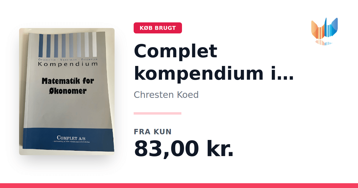 Lige nu kan du købe "Complet kompendium i matematik for økonomer" af Chresten Koed til kun 83,00 kr. Bogen du ser her er brugt, og i god stand. Vi har i øjeblikket kun et enkelt eksemplar til salg af "Complet kompendium i matematik for økonomer", så slå til mens du kan!