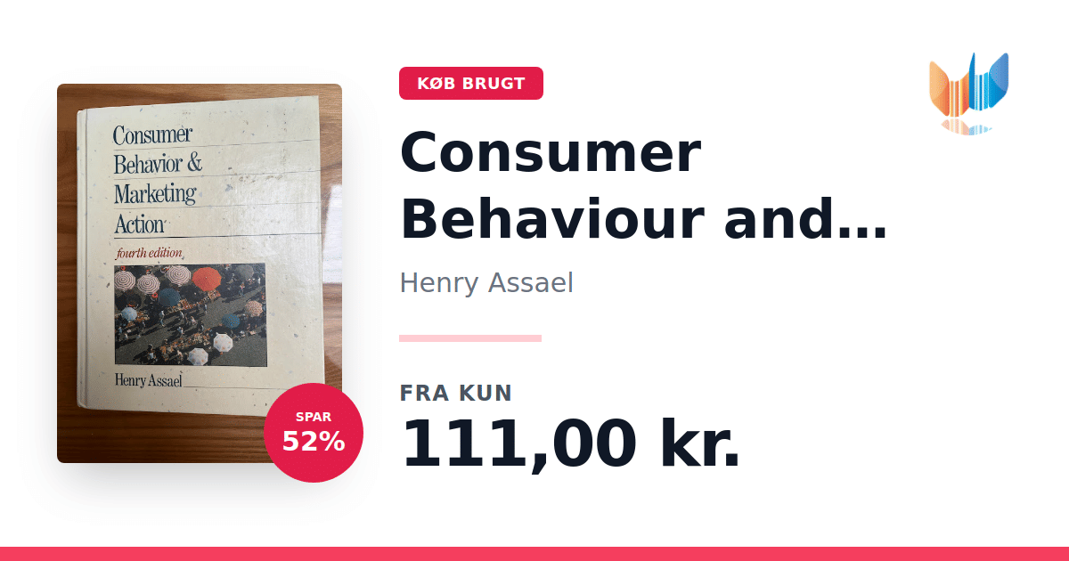 Lige nu kan du købe "Consumer Behaviour and Marketing" af Henry Assael til kun 111,00 kr. Du sparer hele 52% af nyprisen! Bogen du ser her er brugt, og i perfekt stand. Vi har i øjeblikket kun et enkelt eksemplar til salg af "Consumer Behaviour and Marketing", så slå til mens du kan!