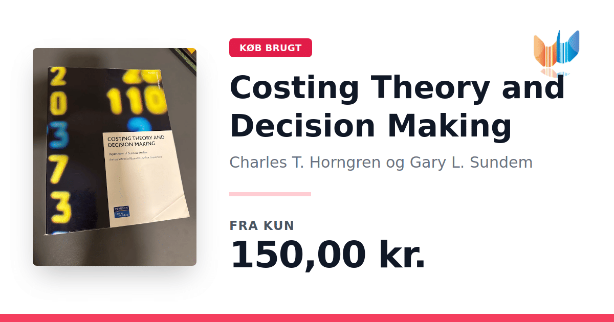 Lige nu kan du købe "Costing Theory and Decision Making" af Charles T. Horngren og Gary L. Sundem til kun 150,00 kr. Bogen du ser her er brugt, og i god stand. Vi har i øjeblikket kun et enkelt eksemplar til salg af "Costing Theory and Decision Making", så slå til mens du kan!