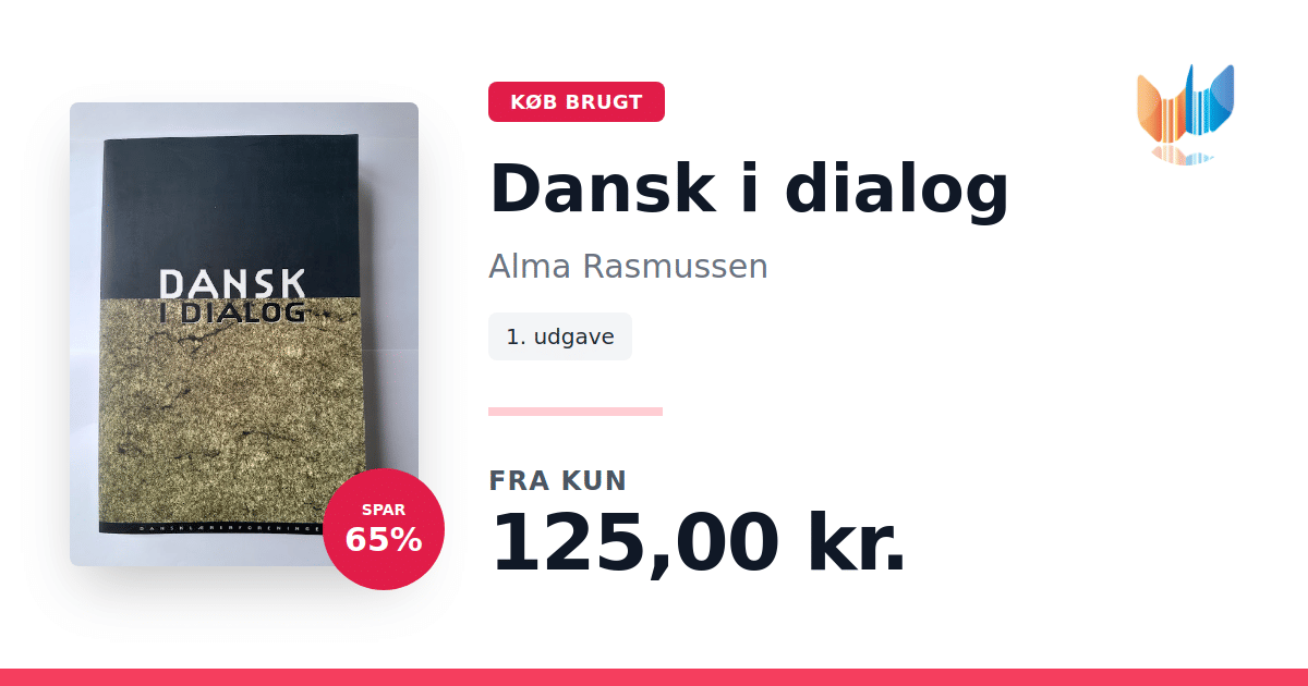 Lige nu kan du købe "Dansk i dialog" af Alma Rasmussen til kun 125,00 kr. Du sparer hele 65% af nyprisen! Bogen du ser her er brugt, og i perfekt stand. Vi har i øjeblikket 3 eksemplarer til salg af "Dansk i dialog", så husk at se de forskellige udgaver.