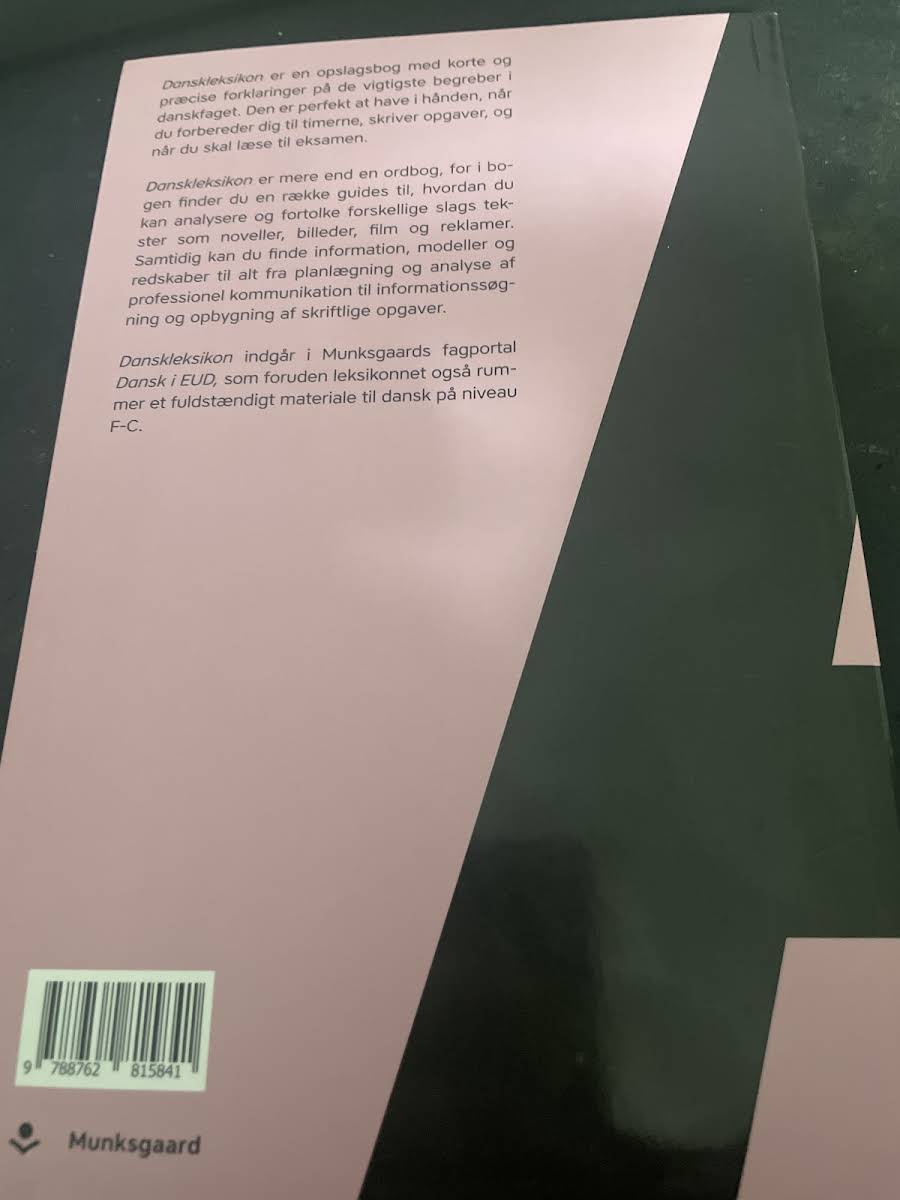 Danskleksikon EUD er et uundværligt opslagsværk til alle, der fordyber sig i danskfaget på erhvervsuddannelserne. Forfatter Cecilie Bogh giver dig en overskuelig gennemgang af centrale begreber, sproglige modeller og faglige metoder. På bogens 120 sider finder du lynhurtige definitioner og konkrete eksempler, der hjælper dig med alt fra tekstforståelse til komposition. Hvert opslag er designet til at give dig et klart overblik, så du nemt kan finde præcis den viden, du har brug for. Du får også praktiske vejledninger til at planlægge din kommunikation og sætte struktur på både skriftlige opgaver og mundtlige fremlæggelser. Med Danskleksikon EUD har du alle de vigtigste redskaber samlet ét sted - lige ved hånden, når du går i gang med dine danskprojekter.