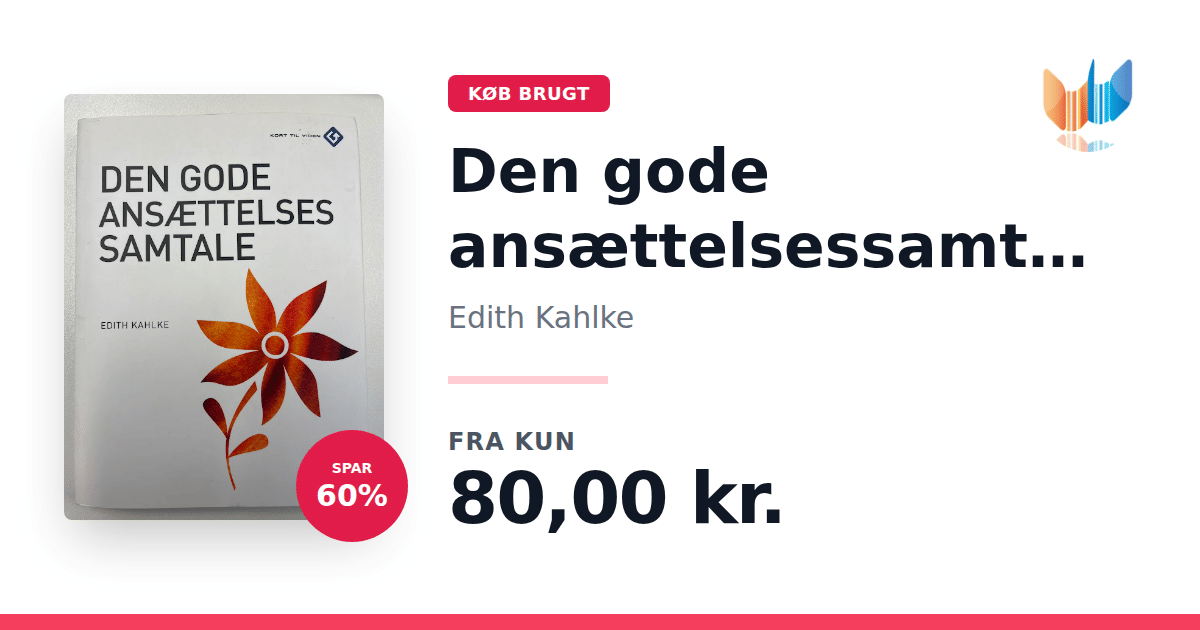 Lige nu kan du købe "Den gode ansættelsessamtale" af Edith Kahlke til kun 80,00 kr. Du sparer hele 60% af nyprisen! Bogen du ser her er brugt, og i perfekt stand. Vi har i øjeblikket kun et enkelt eksemplar til salg af "Den gode ansættelsessamtale", så slå til mens du kan!
