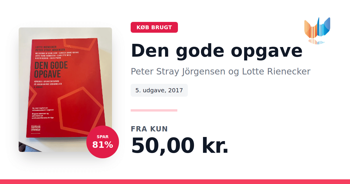 "Den gode opgave" udkommer nu i 5. udgave og er den ubestridte guide for alle studerende, der skal skrive selvstændige og videnskabelige opgaver. I denne udgave har Peter Stray Jörgensen og Lotte Rienecker fået selskab af fem nye medforfattere, som bidrager med deres unikke ekspertise. 5. udgave byder på to nye kapitler – et om videnskabsteori, der belyser, hvordan man omsætter teoretiske overvejelser til praksis, samt et kapitel om litteratur- og informationssøgning, som introducerer de studerende til processen bag en systematisk research. Bogen er fortsat fyldt med konkrete eksempler og aktiviteter, der hjælper den studerende godt på vej i opgaveskrivningen, og har i over 20 år dannet grundlaget for succesfuld akademisk skrivning.
