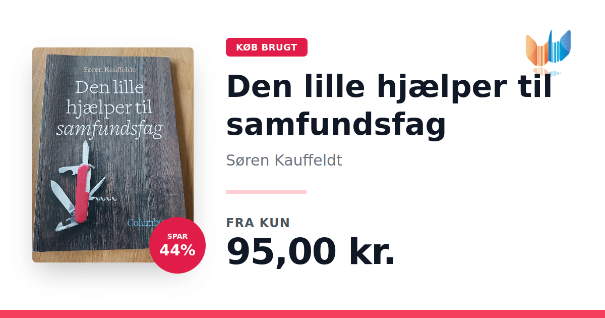 Lige nu kan du købe "Den lille hjælper til samfundsfag" af Søren Kauffeldt til kun 95,00 kr. Du sparer hele 44% af nyprisen! Bogen du ser her er brugt, og i perfekt stand. Vi har i øjeblikket kun et enkelt eksemplar til salg af "Den lille hjælper til samfundsfag", så slå til mens du kan!