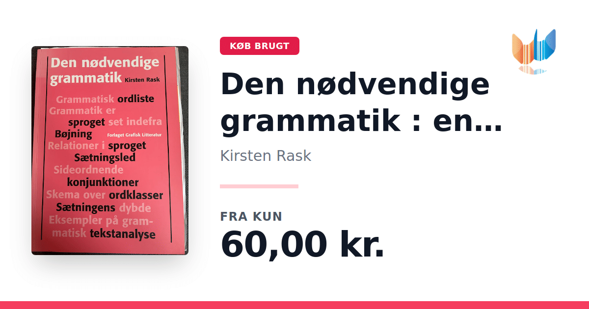 Lige nu kan du købe "Den nødvendige grammatik : en kort oversigt" af Kirsten Rask til kun 60,00 kr. Bogen du ser her er brugt, og i god stand. Vi har i øjeblikket kun et enkelt eksemplar til salg af "Den nødvendige grammatik : en kort oversigt", så slå til mens du kan!