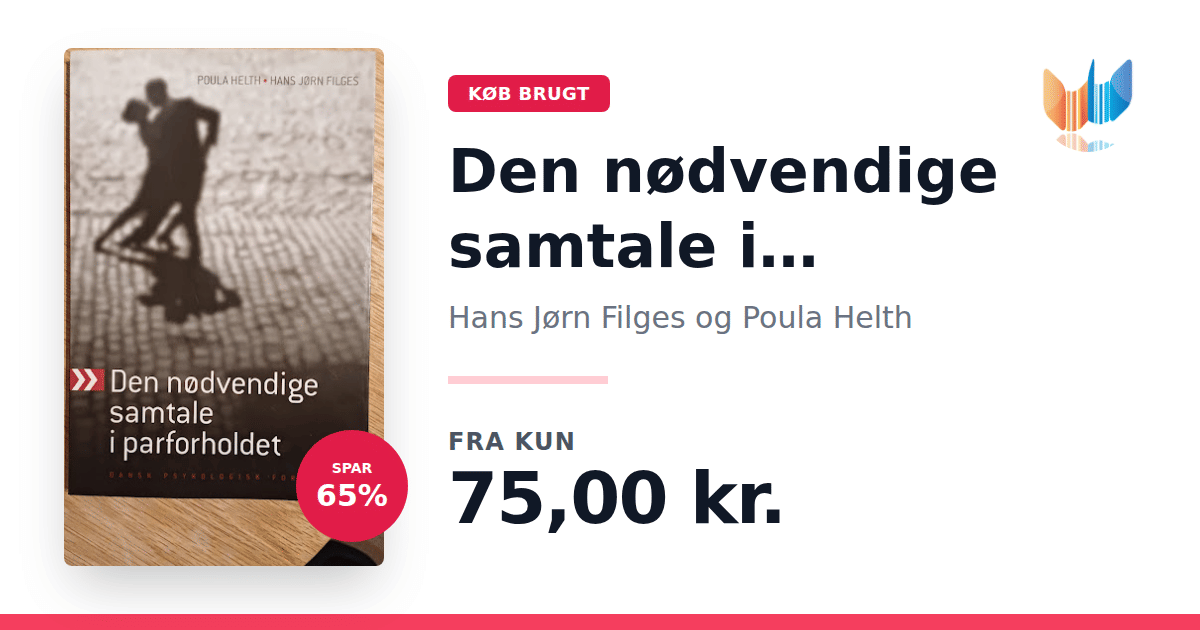 Lige nu kan du købe "Den nødvendige samtale i parforholdet" af Hans Jørn Filges og Poula Helth til kun 75,00 kr. Du sparer hele 65% af nyprisen! Bogen du ser her er brugt, og i perfekt stand. Vi har i øjeblikket 2 eksemplarer til salg af "Den nødvendige samtale i parforholdet", så husk at se de forskellige udgaver.