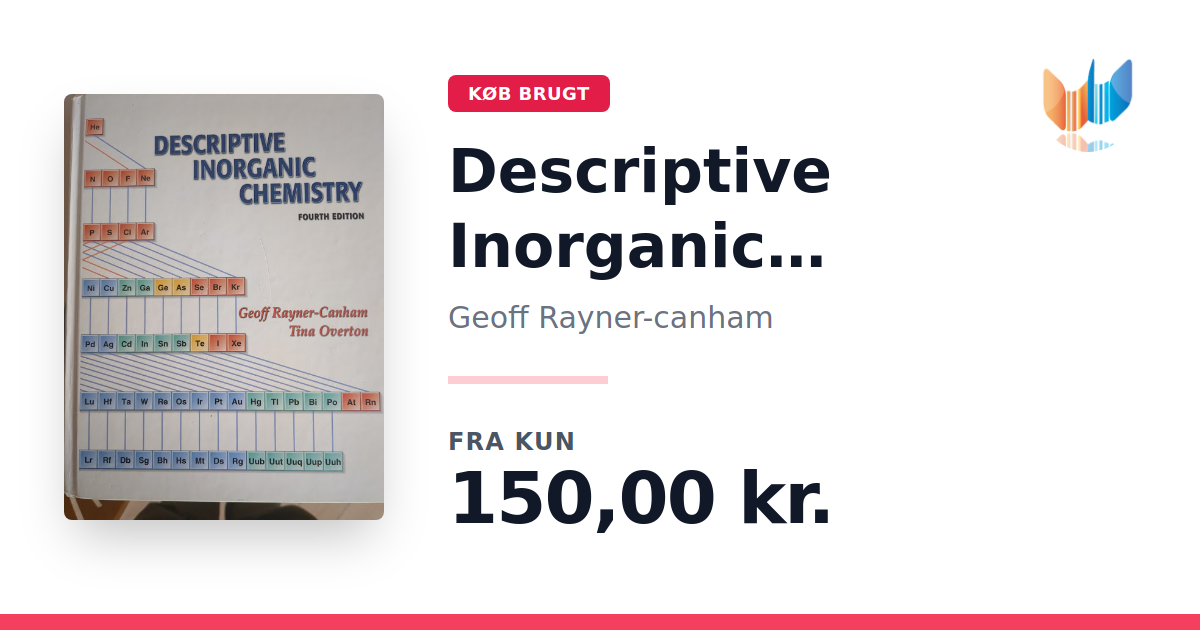 Descriptive Inorganic Chemistry er en bestseller, der præsenterer uorganisk kemi i et beskrivende og lettilgængeligt format med minimal matematik. Geoffrey Rayner-Canham og Tina Overton benytter periodesystemet som det centrale redskab til at udforske grundstoffernes egenskaber og sammenhænge på tværs af grupper. Teksten suppleres af en historisk gennemgang af uorganisk kemiens udvikling samt konkrete eksempler fra industriprocesser og miljømæssige udfordringer. Resultatet er en balanceret og helhedsorienteret forståelse, der klæder studerende på til videre studier og praktiske anvendelser i feltet.