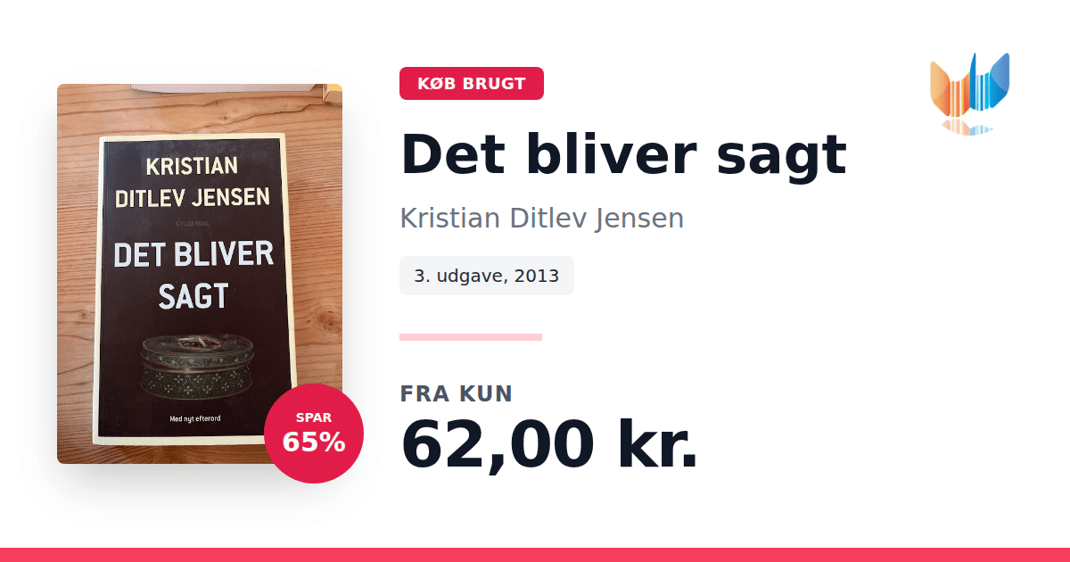 Lige nu kan du købe "Det bliver sagt" af Kristian Ditlev Jensen til kun 62,00 kr. Du sparer hele 65% af nyprisen! Bogen du ser her er brugt, og i perfekt stand. Vi har i øjeblikket kun et enkelt eksemplar til salg af "Det bliver sagt", så slå til mens du kan!