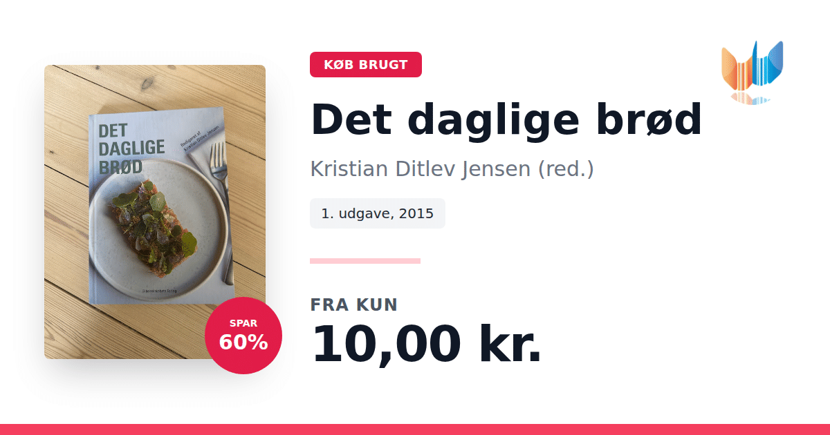 Lige nu kan du købe "Det daglige brød" af Kristian Ditlev Jensen (red.) til kun 10,00 kr. Du sparer hele 60% af nyprisen! Bogen du ser her er brugt, og i perfekt stand. Vi har i øjeblikket kun et enkelt eksemplar til salg af "Det daglige brød", så slå til mens du kan!