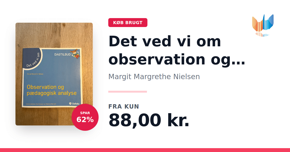 Lige nu kan du købe "Det ved vi om observation og pædagogisk analyse" af Margit Margrethe Nielsen til kun 88,00 kr. Du sparer hele 62% af nyprisen! Bogen du ser her er brugt, og i perfekt stand. Vi har i øjeblikket 3 eksemplarer til salg af "Det ved vi om observation og pædagogisk analyse", så husk at se de forskellige udgaver.