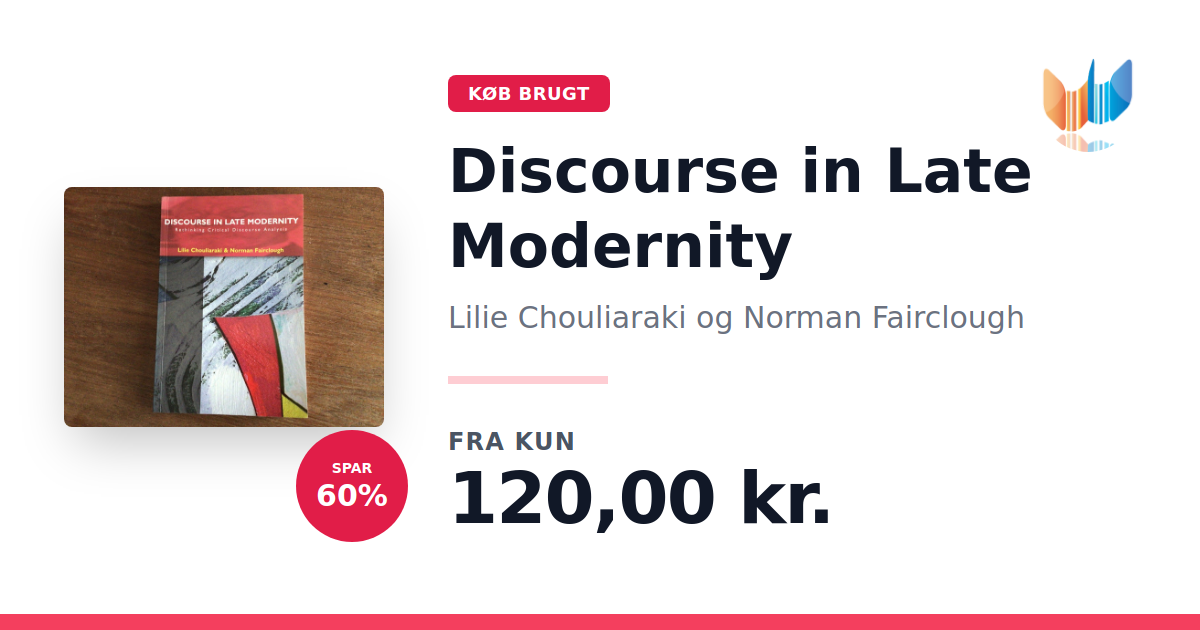 Lige nu kan du købe "Discourse in Late Modernity" af Lilie Chouliaraki og Norman Fairclough til kun 120,00 kr. Du sparer hele 60% af nyprisen! Bogen du ser her er brugt, og i perfekt stand. Vi har i øjeblikket kun et enkelt eksemplar til salg af "Discourse in Late Modernity", så slå til mens du kan!