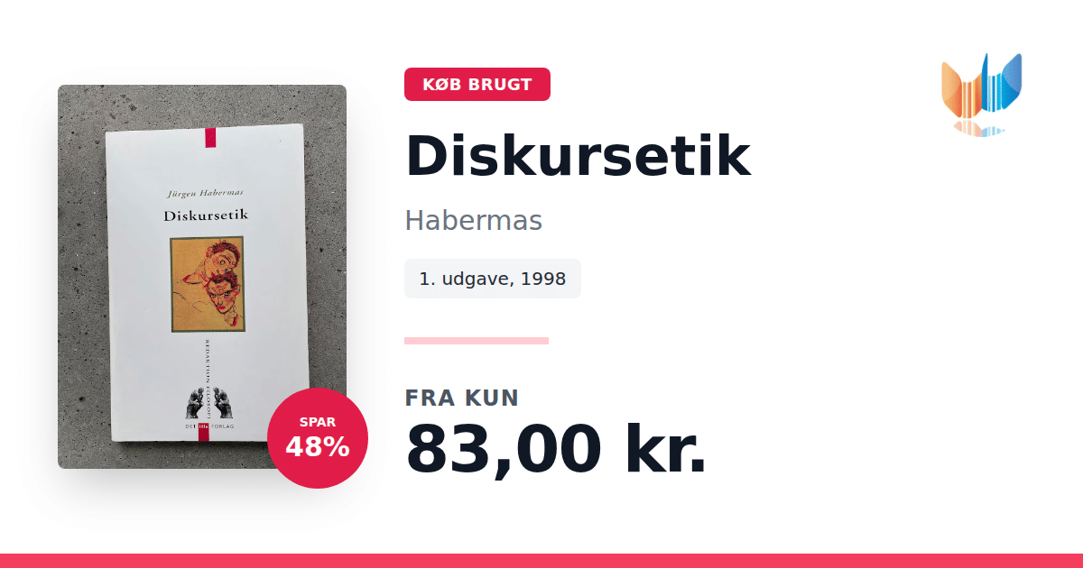 Lige nu kan du købe "Diskursetik" af Habermas til kun 83,00 kr. Du sparer hele 48% af nyprisen! Bogen du ser her er brugt, og i perfekt stand. Vi har i øjeblikket kun et enkelt eksemplar til salg af "Diskursetik", så slå til mens du kan!