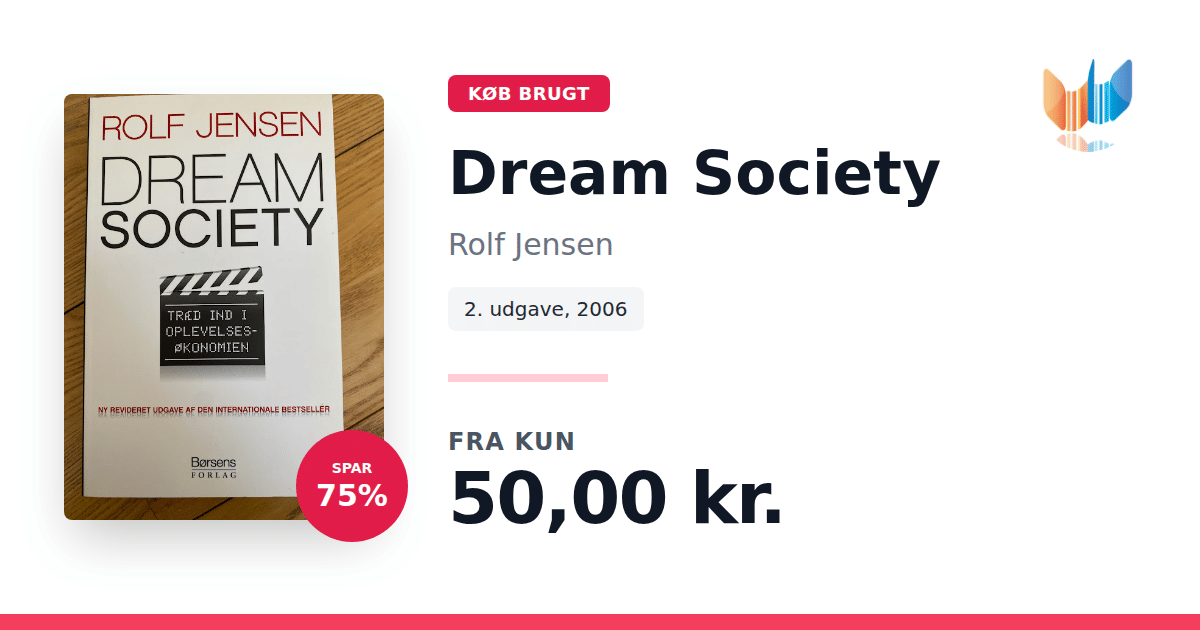 Lige nu kan du købe "Dream Society" af Rolf Jensen til kun 50,00 kr. Du sparer hele 75% af nyprisen! Bogen du ser her er brugt, og i perfekt stand. Vi har i øjeblikket kun et enkelt eksemplar til salg af "Dream Society", så slå til mens du kan!