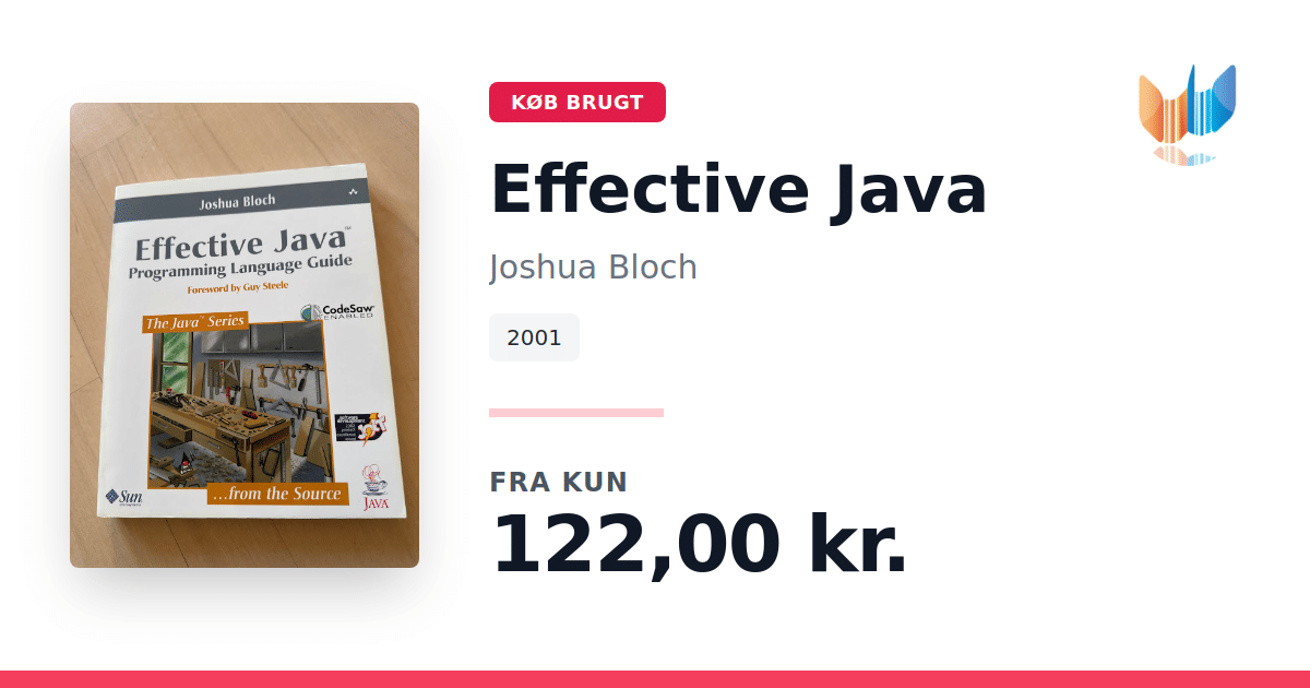Lige nu kan du købe "Effective Java" af Joshua Bloch til kun 122,00 kr. Bogen du ser her er brugt, og i perfekt stand. Vi har i øjeblikket kun et enkelt eksemplar til salg af "Effective Java", så slå til mens du kan!