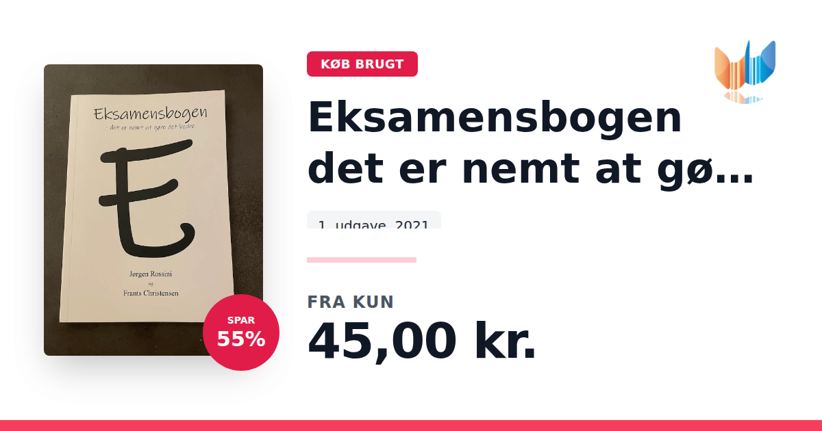 Lige nu kan du købe "Eksamensbogen det er nemt at gøre det bedre" til kun 45,00 kr. Du sparer hele 55% af nyprisen! Bogen du ser her er brugt, og i perfekt stand. Vi har i øjeblikket kun et enkelt eksemplar til salg af "Eksamensbogen det er nemt at gøre det bedre", så slå til mens du kan!
