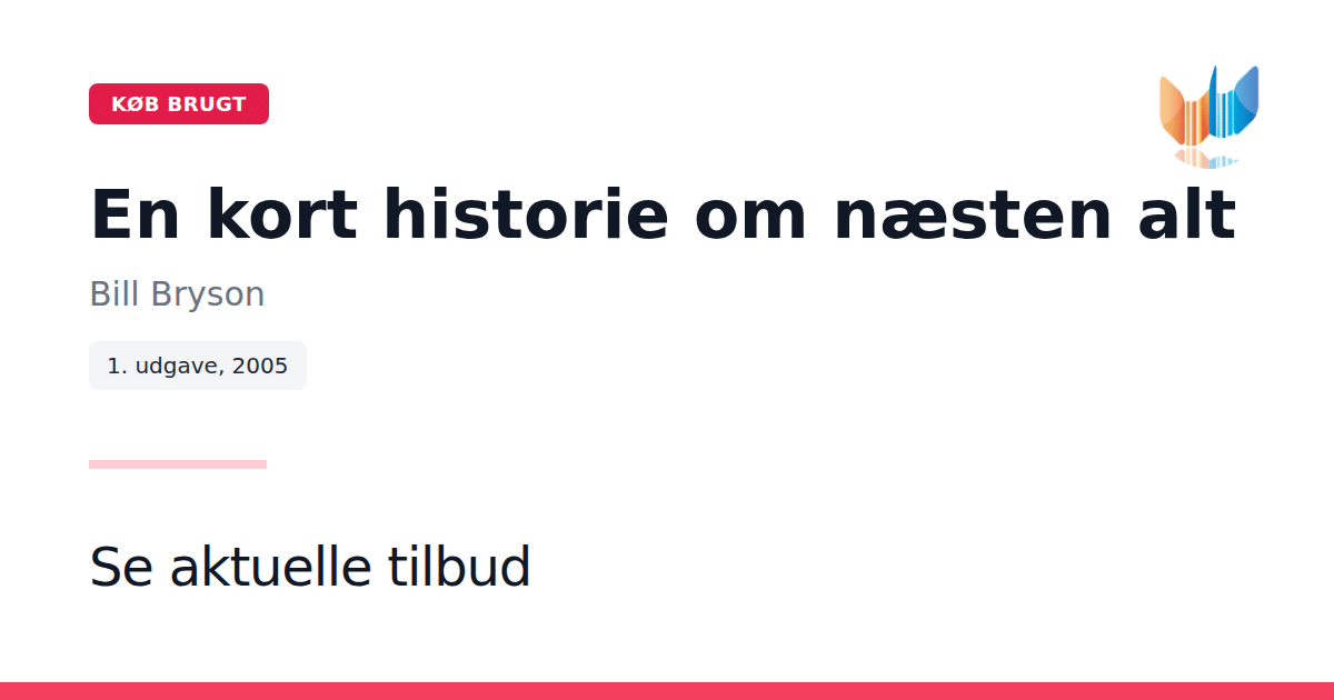 Bill Brysons En kort historie om næsten alt byder på en fængslende opdagelsesrejse gennem universets og naturens mest grundlæggende mysterier. Gennem en nysgerrig og humoristisk fortælling udfolder forfatteren videnskabens store gåder – fra universets spæde begyndelse og Big Bang til alt det mindste i menneskets molekyler og atomernes dans. Med et sprog, der både er underholdende og præcist, guider Bryson læseren igennem en verden, hvor komplekse emner bliver tilgængelige for enhver. Bogen præsenterer fakta, forklaringer og fortællinger, der vækker både undren og glæde, og er et oplagt valg for alle, der elsker at stille spørgsmål om naturens store sammenhænge. Denne første udgave, udgivet af Gyldendal i 2005, er en inspirerende opdagelsesrejse, der forener nysgerrighed og videnskabelig indsigt på en overraskende og tankevækkende måde.