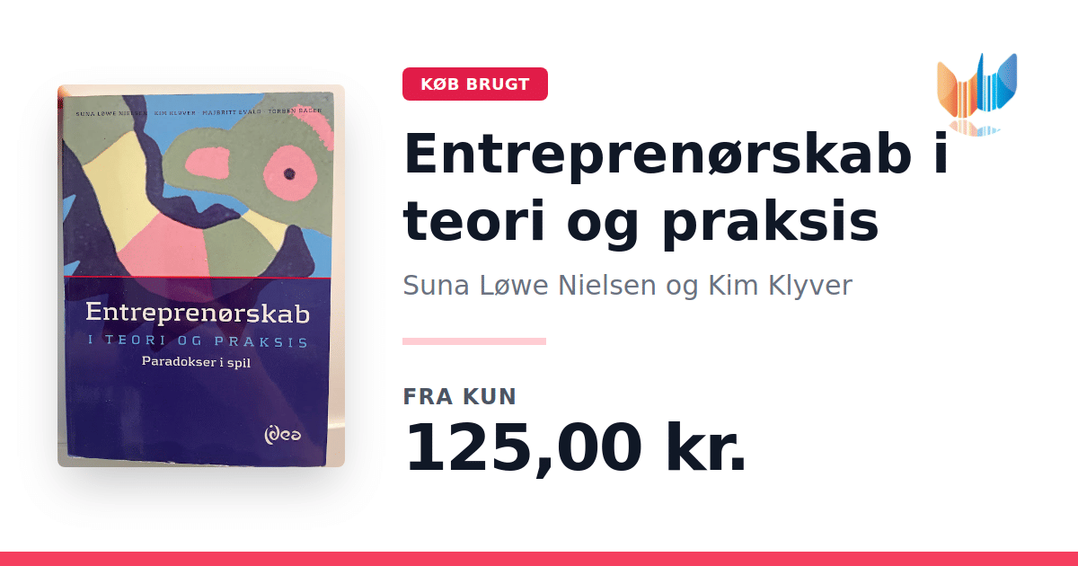 Lige nu kan du købe "Entreprenørskab i teori og praksis" af Suna Løwe Nielsen og Kim Klyver til kun 125,00 kr. Bogen du ser her er brugt, og i god stand. Vi har i øjeblikket 2 eksemplarer til salg af "Entreprenørskab i teori og praksis", så husk at se de forskellige udgaver.