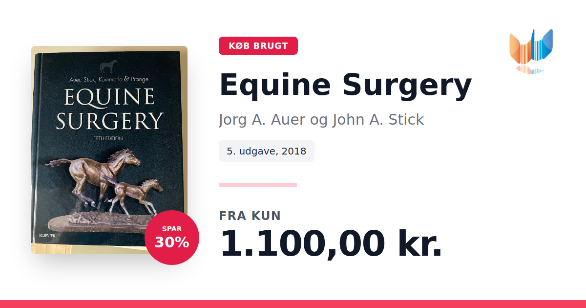 Lige nu kan du købe "Equine Surgery" af Jorg A. Auer og John A. Stick til kun 1.100,00 kr. Du sparer hele 30% af nyprisen! Bogen du ser her er brugt, og i perfekt stand. Vi har i øjeblikket kun et enkelt eksemplar til salg af "Equine Surgery", så slå til mens du kan!