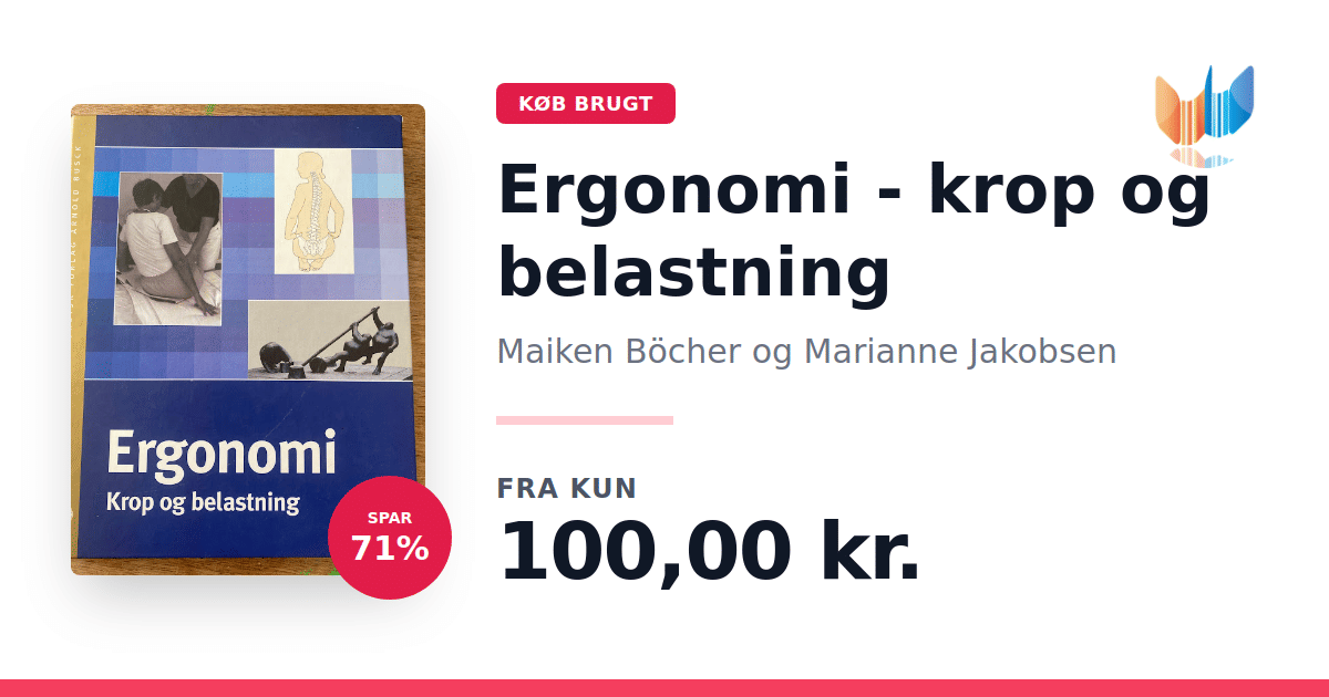 Lige nu kan du købe "Ergonomi - krop og belastning" af Maiken Böcher og Marianne Jakobsen til kun 100,00 kr. Du sparer hele 71% af nyprisen! Bogen du ser her er brugt, og i god stand. Vi har i øjeblikket 2 eksemplarer til salg af "Ergonomi - krop og belastning", så husk at se de forskellige udgaver.