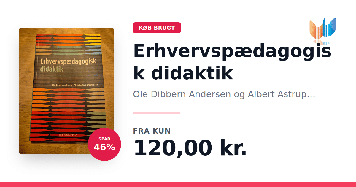 Lige nu kan du købe "Erhvervspædagogisk didaktik" af Ole Dibbern Andersen og Albert Astrup Christensen til kun 120,00 kr. Du sparer hele 46% af nyprisen! Bogen du ser her er brugt, og i perfekt stand. Vi har i øjeblikket kun et enkelt eksemplar til salg af "Erhvervspædagogisk didaktik", så slå til mens du kan!