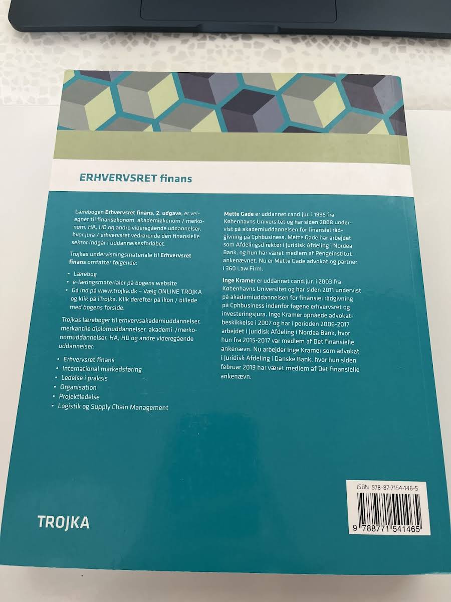 Erhvervsret – Finans, 2. udgave af Inge Kramer er udarbejdet med henblik på undervisning i erhvervsret og erhvervsjura på diverse videregående uddannelser, herunder finansøkonom, akademiøkonom, merkonom, HA og HD. Bogen er nøje tilrettelagt i overensstemmelse med studieordninger og fagplaner og møder de aktuelle behov hos studerende, der ønsker en solid introduktion til juridiske problemstillinger i erhvervslivet. I denne opdaterede udgave, der indgår de seneste lovændringer pr. juni 2020, præsenteres stoffet på en pædagogisk og indbydende måde. Gennemgående anvendes margennoter, grafiske illustrationer, figurer og skemaer, og hvert kapitel afsluttes med en samlet tjekliste over de centrale hovedregler og principper. Praksisnære eksempler og illustrative domme gør stoffet levende og understøtter den teoretiske gennemgang. Med sine 642 sider tilbyder bogen et bredt og vellavet overblik over centrale juridiske emner inden for erhvervsret, og den er et uundværligt redskab for både studerende og undervisere, der ønsker at få indsigt i juraens verden på et højt fagligt niveau.