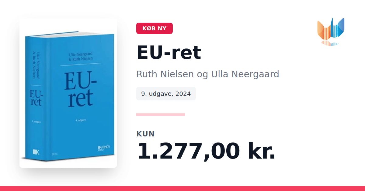 Nyt i 9. udgave Denne udgave viderefører og opdaterer 8. udgave fra 2020 og giver et aktuelt billede af EU-rettens principper, dynamik og hovedstruktur per primo 2024. Ved hjælp af retsdogmatisk metode og med udgangspunkt i europæisk realistisk retspositivisme præsenteres både grundlæggende teorier og praktiske sammenhænge i gældende EU-ret. Bogen er opdelt i to hoveddele: Del I om de institutionelle og konstitutionelle hovedtræk, og Del II om det indre marked og fri bevægelighed. Del I behandler EU’s opbygning og historiske udvikling, nøgleværdier og retlige instrumenter, herunder nye politikområder som retsstat, klima og bæredygtighed, energi, forsvar samt digitalisering. Desuden gennemgås EU’s institutioner, retskilder, almindelige retsprincipper, grundlæggende rettigheder samt samspillet mellem EU-ret, national ret og folkeret og Den Økonomiske og Monetære Union. Del II giver en systematisk indføring i fri bevægelighed i det indre marked med særskilte kapitler om varer, tjenesteydelser, etableringsfrihed, kapitalens og arbejdskraftens fri bevægelighed samt unionsborgerskab og tredjelandsstatsborgere. Målgruppe EU-ret henvender sig til studerende og undervisere på jurastudiet og fungerer tillige som opslagsværk og reference for advokater, dommere, embedsmænd, journalister og andre, der har behov for en grundlæggende og opdateret indsigt i EU-rettens struktur og virke. Forfattere Ruth Nielsen og Ulla Neergaard står bag værket. Ulla Neergaard er professor i EU-ret ved Juridisk Fakultet, Københavns Universitet.