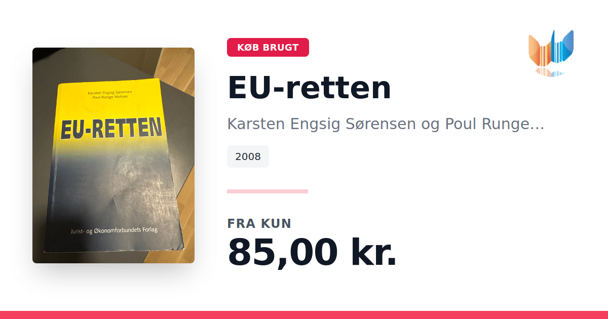 Lige nu kan du købe "EU-retten" af Karsten Engsig Sørensen og Poul Runge Nielsen til kun 85,00 kr. Bogen du ser her er brugt, og i god stand. Vi har i øjeblikket 2 eksemplarer til salg af "EU-Retten", så husk at se de forskellige udgaver.