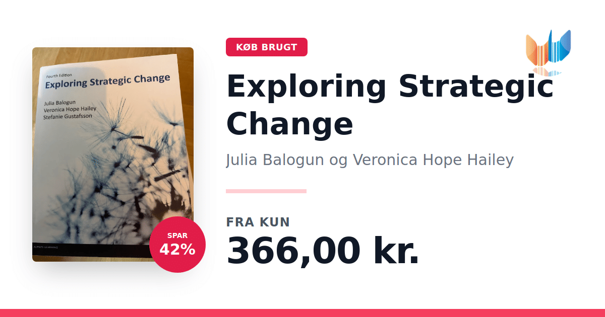 Lige nu kan du købe "Exploring Strategic Change" af Julia Balogun og Veronica Hope Hailey til kun 366,00 kr. Du sparer hele 42% af nyprisen! Bogen du ser her er brugt, og i perfekt stand. Vi har i øjeblikket 3 eksemplarer til salg af "Exploring Strategic Change", så husk at se de forskellige udgaver.
